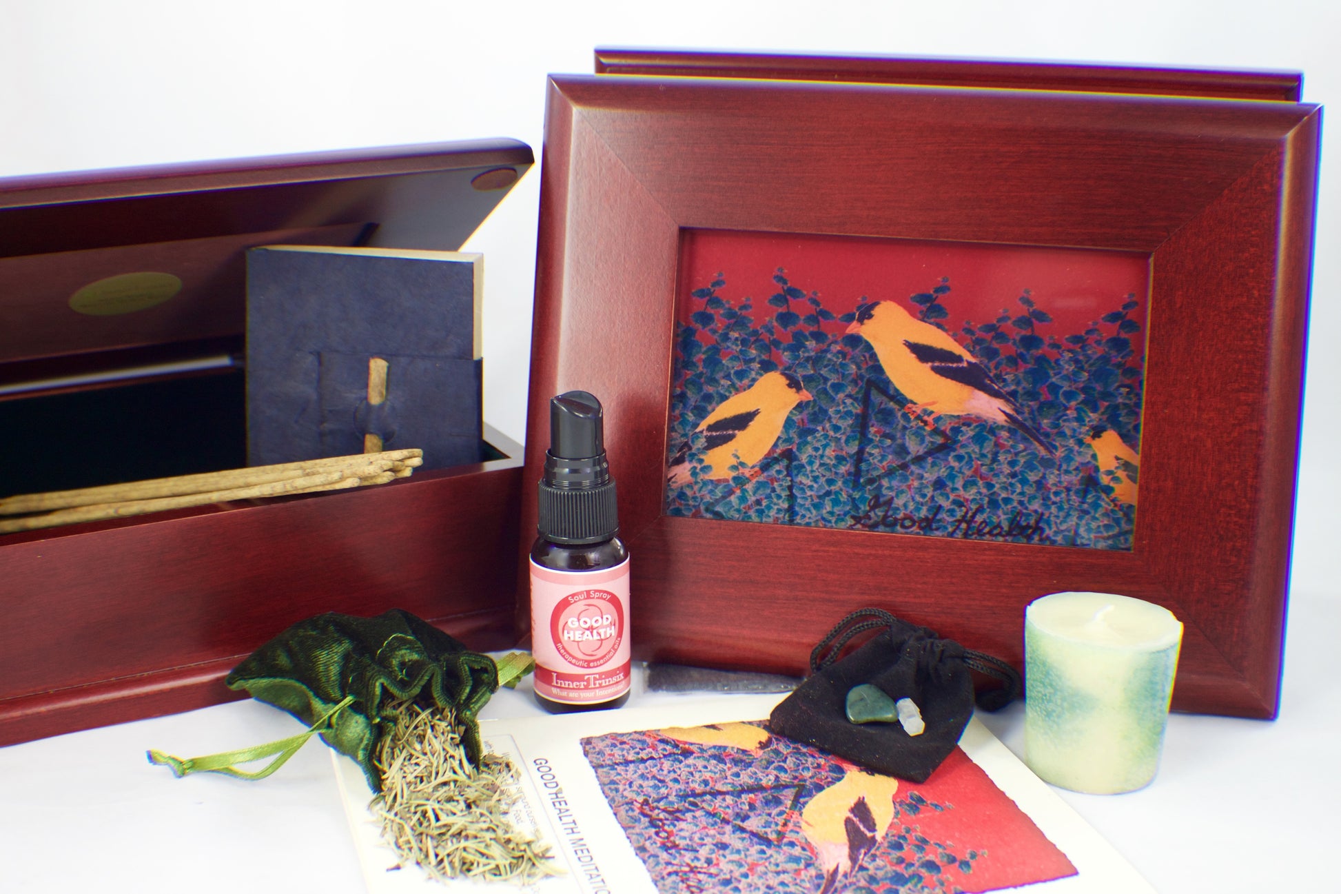When navigating a spiritual path, it can be difficult to know which items and approaches are the right or most effective ones to use in manifesting your desires. Great news: we’ve done the research for you, and created collection of tools for Good Health encased in a decorative cherry wooden box.