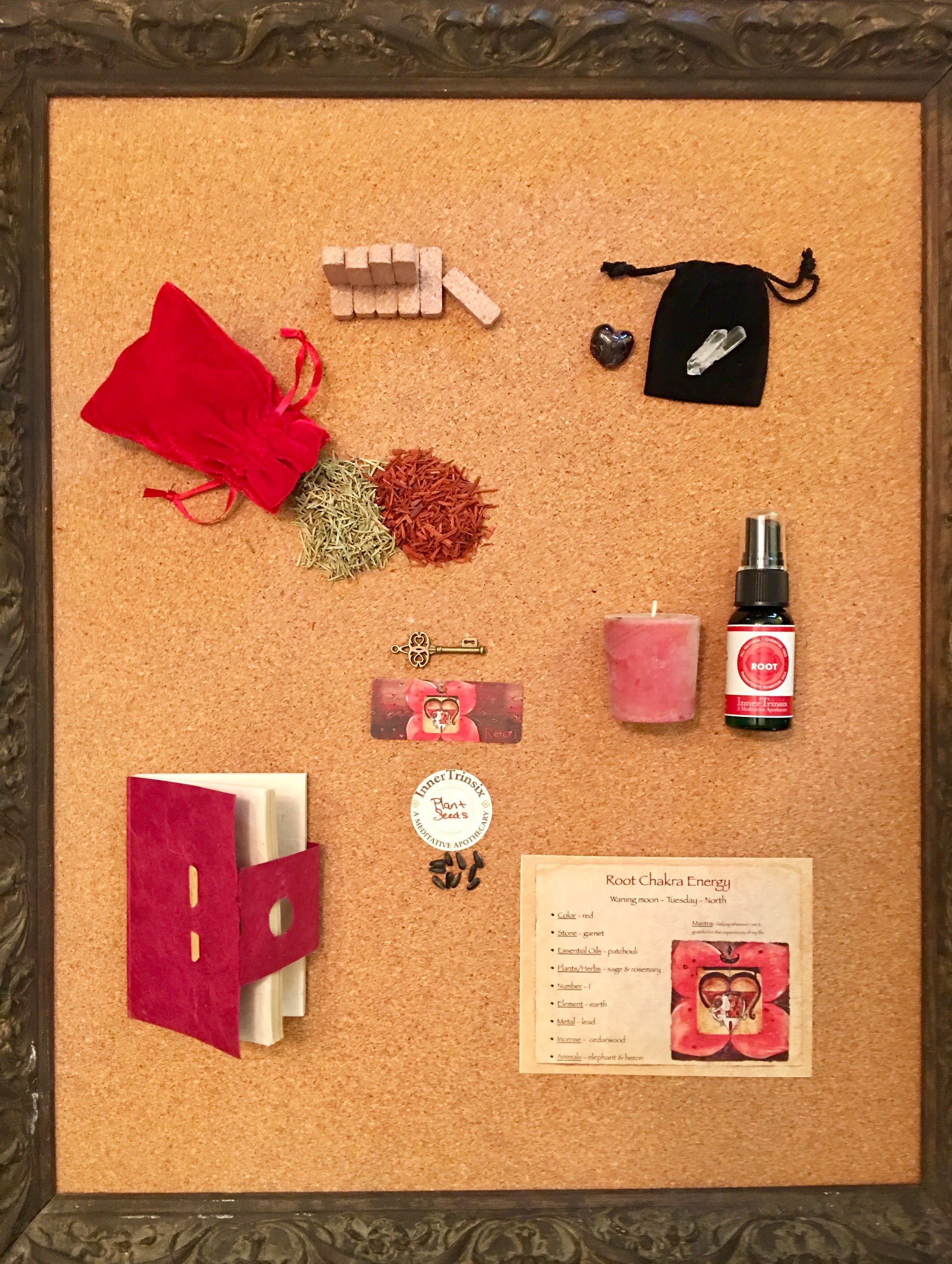 Awareness Card – This card carries the following awareness information to activate the root chakra: moon cycle, day of the week, mantra, color, stones, essential oils, plants, herbs, element, metal, numbers, incense, animals, and foods.